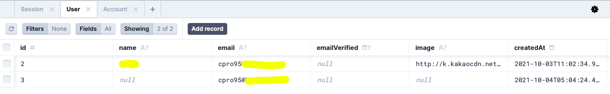 그럼 개발서버를 로그아웃하고 prisma studio에서 session이랑 user, account를 다 지우고 다시 해 보겠습니다.