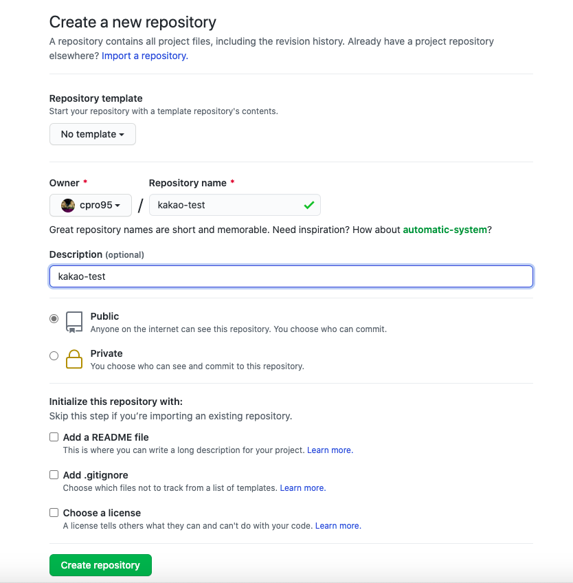 Github에 가셔서 새로운 Repository를 만듭니다. 우리의 프로젝트 이름이 kakao-test이니까 이름도 같은 걸로 했습니다.