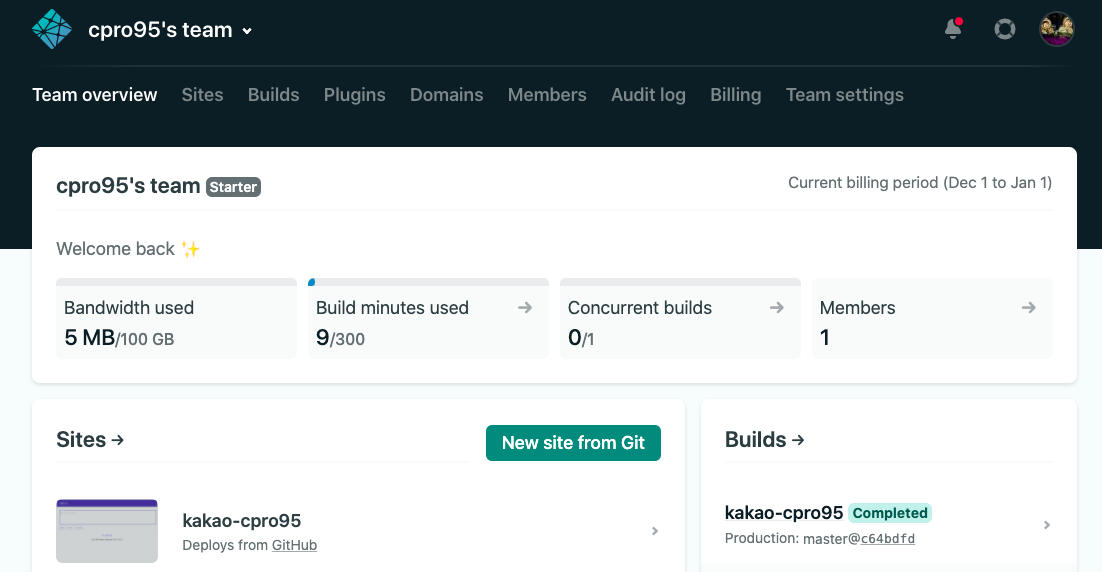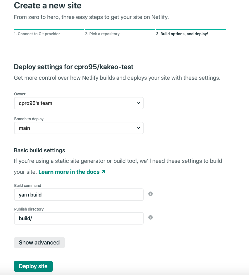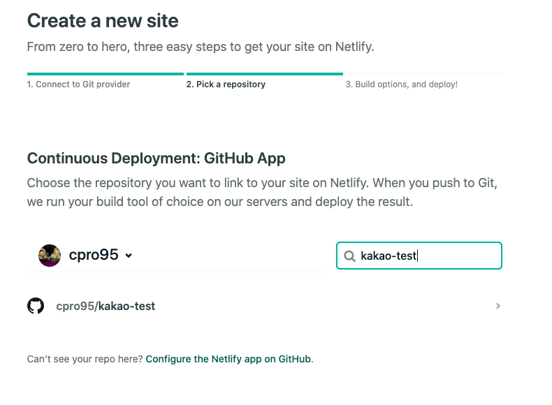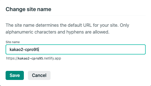 예를 들어, 저는 kakao-cpro95.netlify.app 이라고 이름을 지었는데 앞에 kakao-cpro95는 본인만의 이름이고 뒤에 netlify.app은 지정입니다.