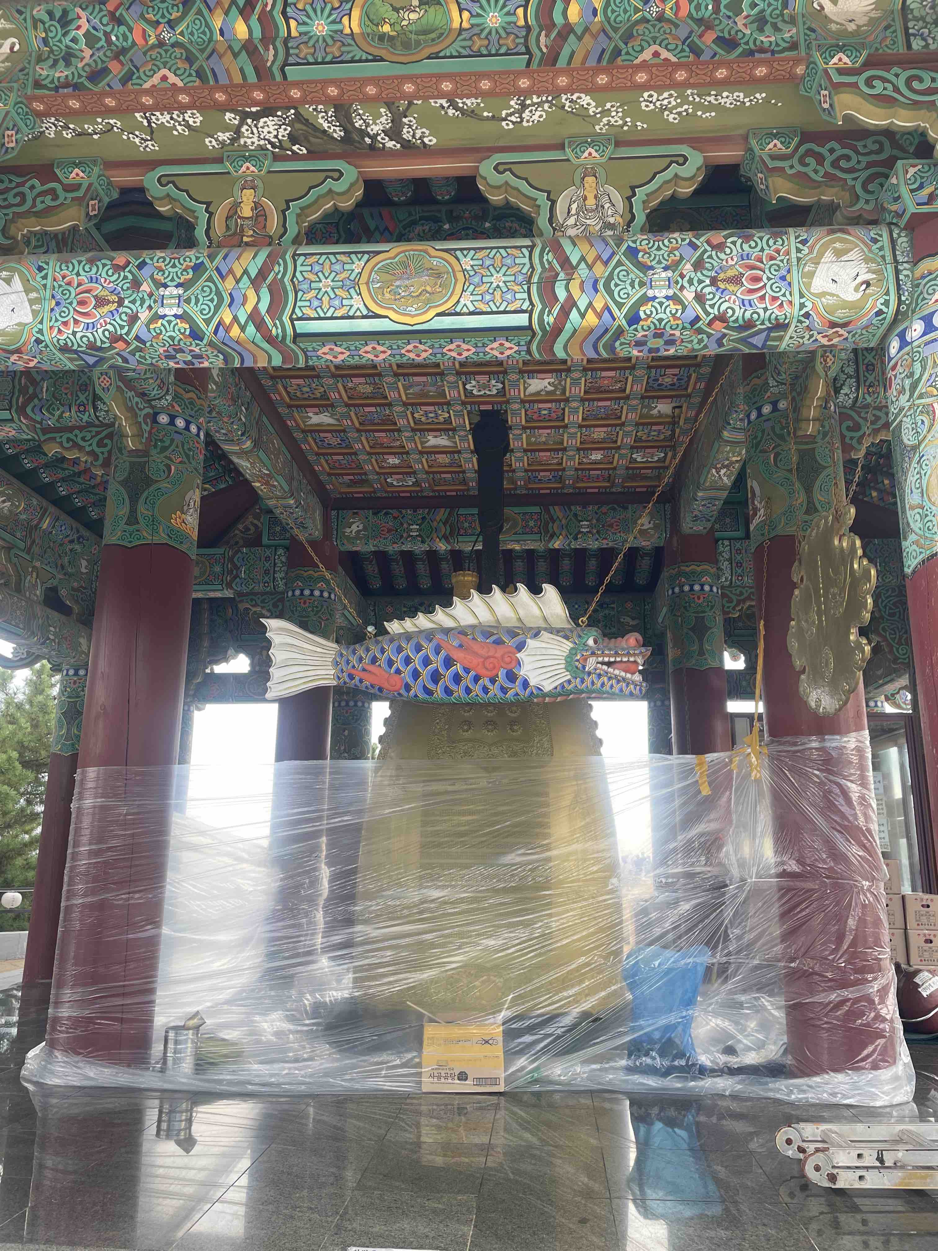 입구 쪽 지혜관음전에 있는 대형 범종이 보입니다. 안타깝게 수리 중인 거 같습니다.