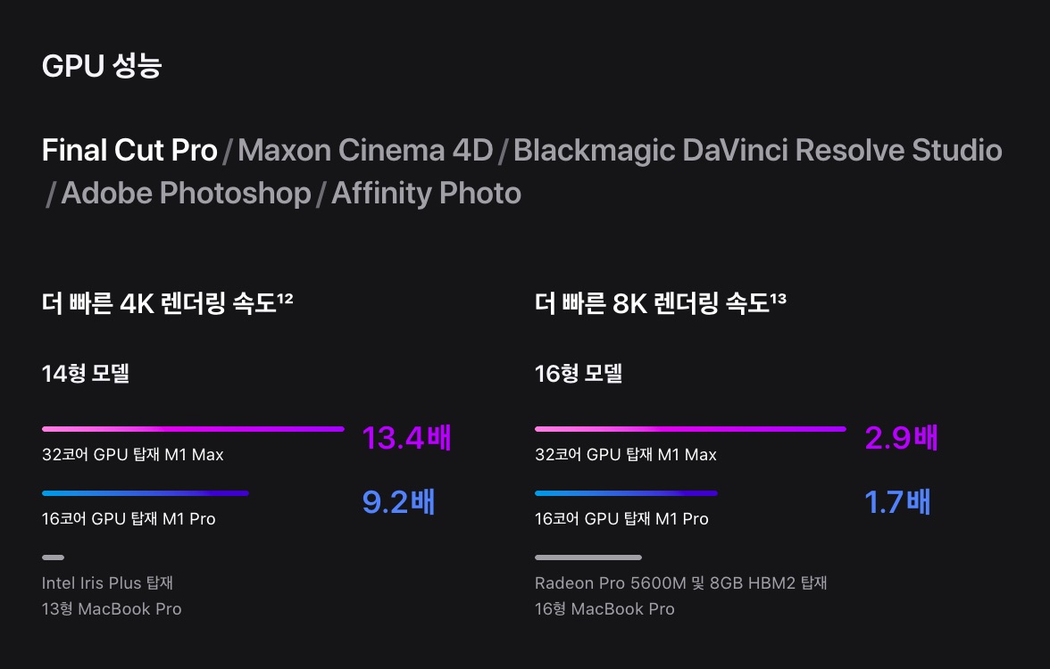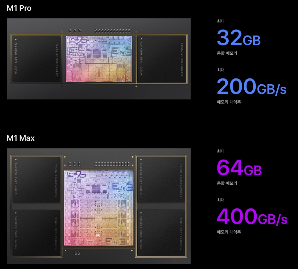 기존보다 메모리는 듀얼채널, 쿼드 채널 이런 식으로 올라 가는 거고 GPU도 Nvidia의 SLI 같은 방식으로 그래픽 카드를 더 꽂은 건데 M1 Pro는 한 개를 더 꽂은거고 M1 Max는 세 개를 더 꽂은거라고 볼 수 있습니다.