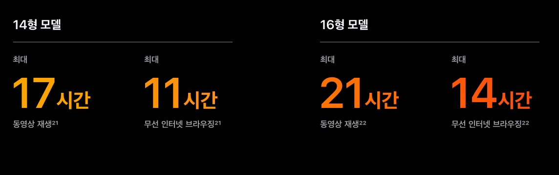 배터리가 지금 발표된게 영상재생 기준으로 14.2인치가 17시간, 그리고 16.2인치가 21시간입니다. 어마어마합니다.