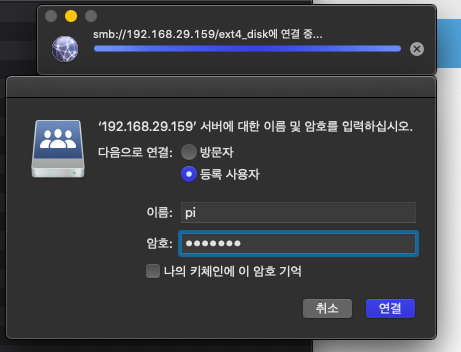 네트워크 자격 증명을 입력하라고 나오는데요. pi 사용자와 비밀번호를 입력하면 됩니다.