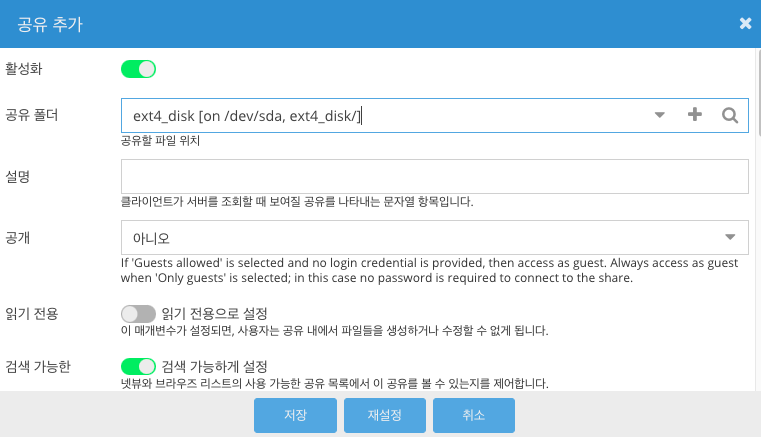 단순히 활성화 누르고 공유 버튼을 눌러 아까 위에서 처럼 공유 폴더를 선택하고 저장을 누르시면 됩니다.
