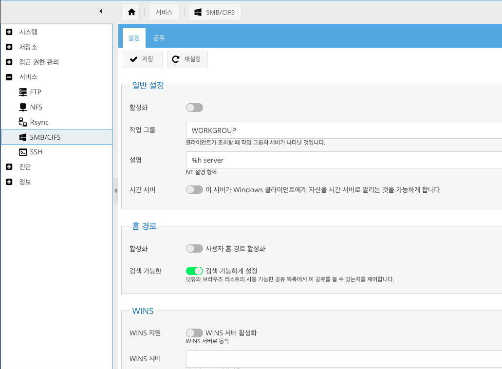 아래 그림처럼 서비스 카테고리에서 SMB/CIFS를 누릅니다.