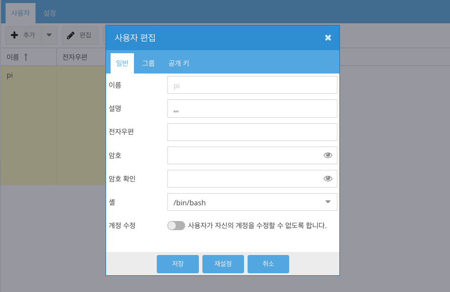 그래서 OpenMediaVault 대시보드에서 다시 아래 그림처럼 사용자로 가셔서 pi를 선택하시고 편집을 누르십시오.