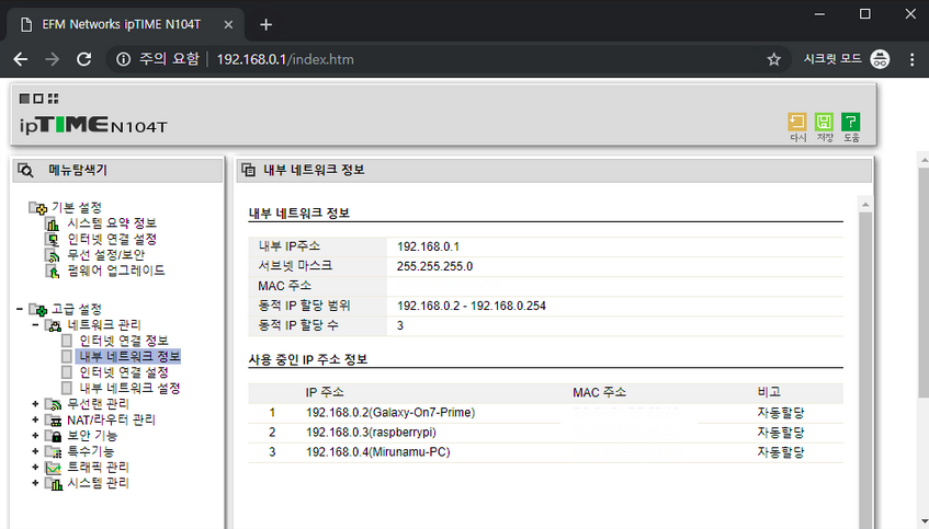 집에서 사용하는 공유기 환경설정 화면으로 접속하면 됩니다.