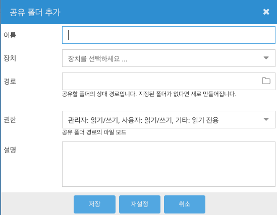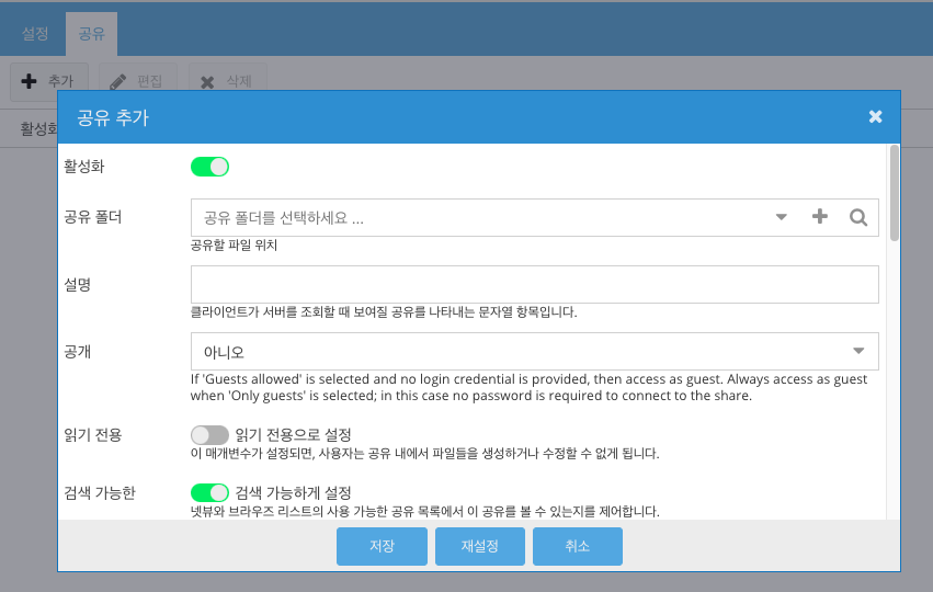 공유 탭에서 공유 폴더를 꼭 지정해 줘야 합니다.