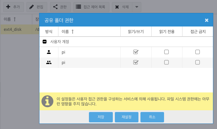 위 그림처럼 pi 사용자 및 pi 그룹에게 읽기/쓰기 권한을 부여합시다.
