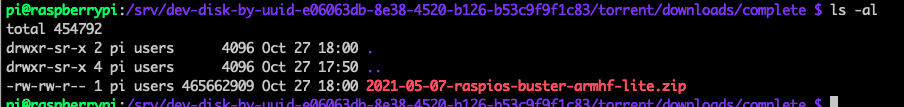 그러면 실제 라즈베리파이 외장하드에 다음과 같이 torrent 폴더가 생성됩니다.