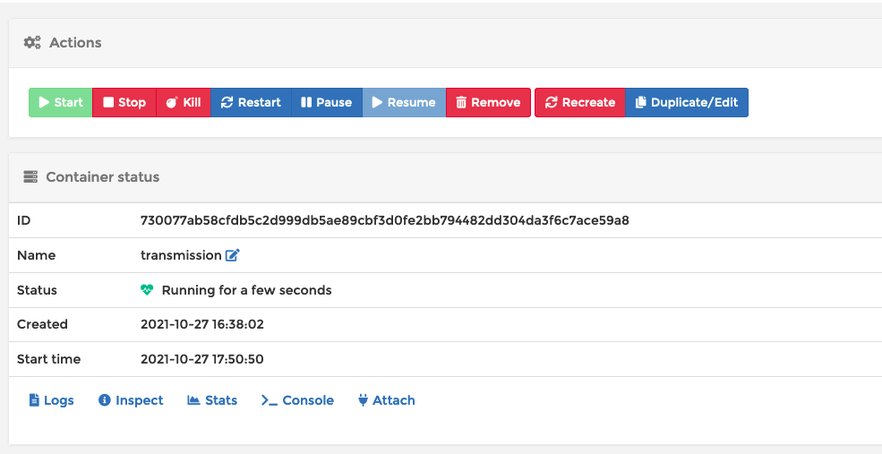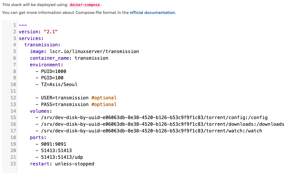 이제 맨 밑에 Deploy the stack 버튼을 누르면 도커 이미지가 pull 되면서 transmission 도커가 완성됩니다.