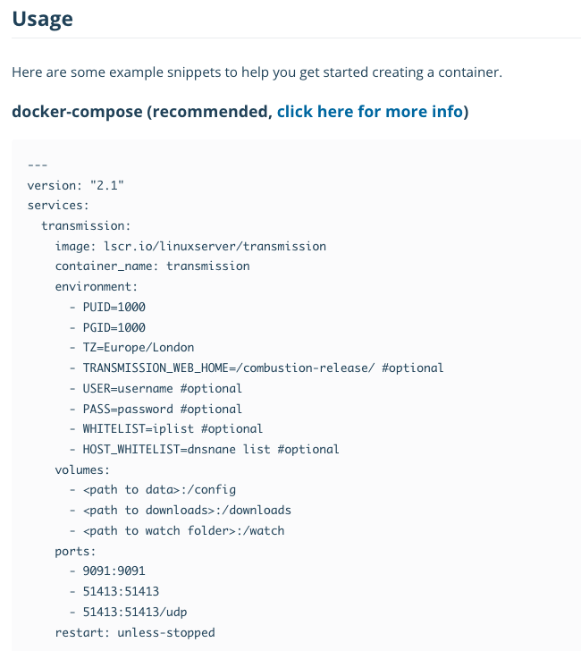 바로 https://hub.docker.com/r/linuxserver/transmission 페이지에서 아래쪽에 가보면 Usage라고 되어 있습니다.
