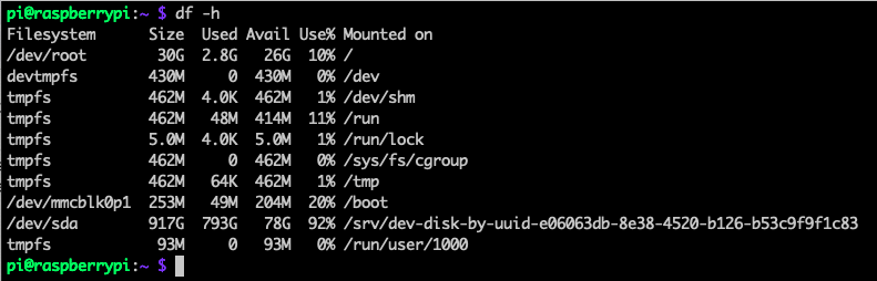 자 보시면 우리가 외장하드로 마운트 한 게 /dev/sda이고 마운트 위치가 바로 /srv/dev-disk-by-uuid---------- 부분입니다.