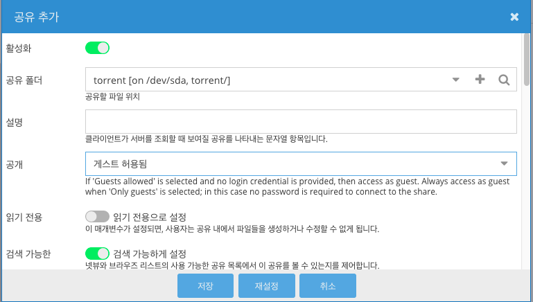SMB로 연결하시려면 OMV 대시보드에서 SMB 부분에서 공유 추가를 해주시기 바랍니다.