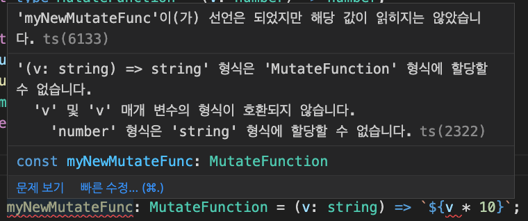 myNewMuatateFunc 함수의 타입이 MutateFunction인데 MutateFunction 타입은 숫자를 받아 숫자를 리턴하는 타입인데, 위 코드에서는 string을 받아서 string을 리턴한다고 불평하고 있네요.
