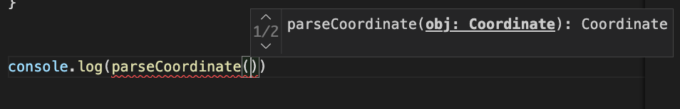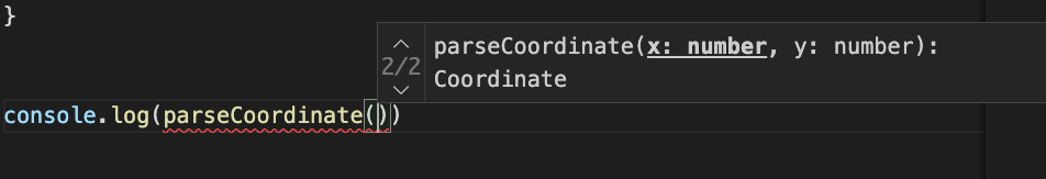 인텔리 센스가 아래 그림처럼 우리의 함수 오버로딩한 parseCoordinate 함수의 타입을 보여주고 있습니다.