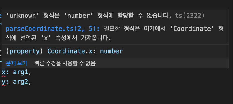즉, arg1 이 처음에는 unknown 타입이었지만 as 키워드를 써서 실제 구현 시 Coordinate 타입이 된 겁니다.