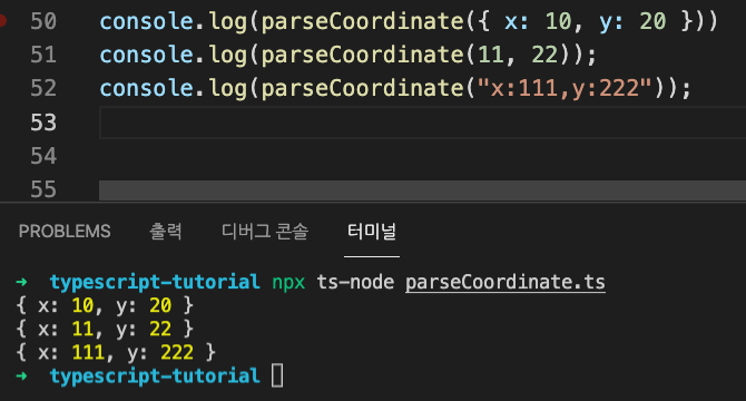 두 번째, parseCoordinateFromNumbers란 함수는 x, y의 number 타입을 인수로 받아서 Coordinate란 인터페이스를 리턴하는 함수입니다.