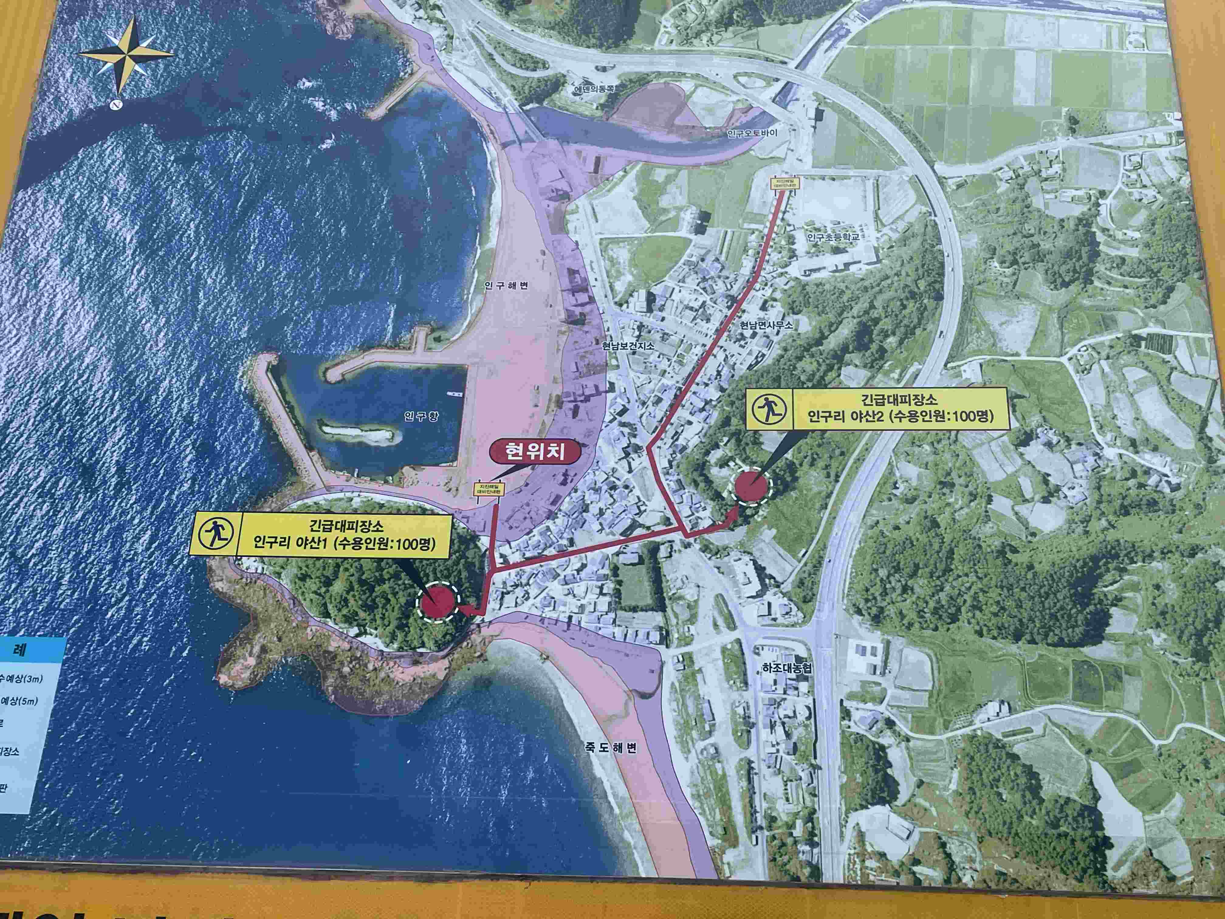 인구항 쪽 인구해변과 그 아래쪽 죽도해변 가운데 죽도가 위치해 있습니다.