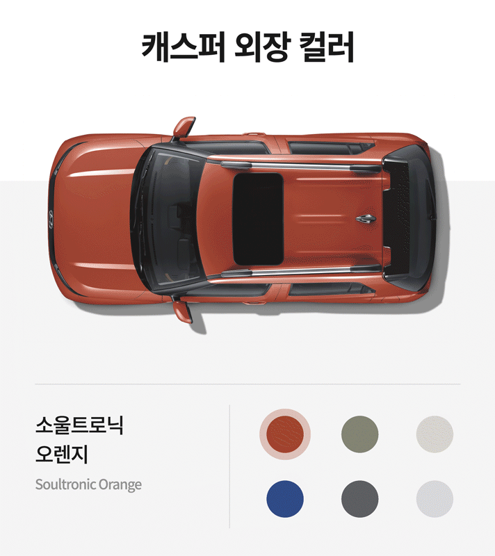 아울러 강한 햇빛 아래서도 오렌지 컬러가 돋보이게 표현했으며, 어디서든 캐스퍼가 주목을 받을 수 있게 디자인된 컬러다.