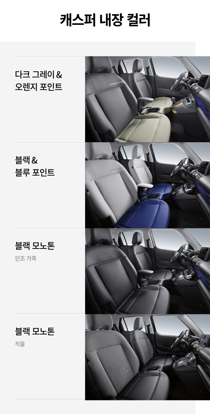 캐스퍼의 실내는 블랙 원톤과 그레이 기반에 라이트 카키 및 파스텔 오렌지가 조합된 컬러, 그리고 블랙 기반에 블루 및 레몬이 조합된 컬러로 구성된다.