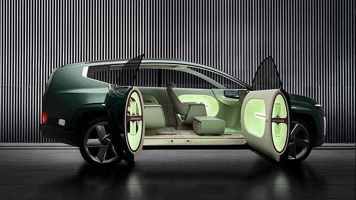 세븐은 2019년 ‘45’, 2020년 ‘프로페시’에 이어 전용 전기차 브랜드 아이오닉의 세 번째 도약을 알리는 콘셉트카인데요. 대형 SUV 전기차 비전을 제시하는 모델로 고객 중심의 새로운 전기차 일상을 선사할 예정입니다.