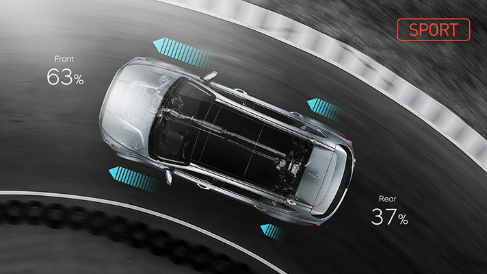HTRAC은 주행 환경의 변화에 따라 전륜과 후륜의 구동력을 능동적으로 배분하여 노면과의 접지력을 최적화한다.