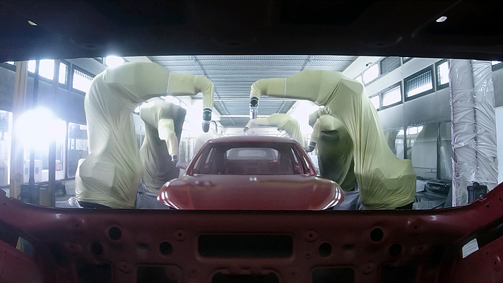 차체의 틀을 갖춘 뒤에는 도장 공정으로 이어간다.