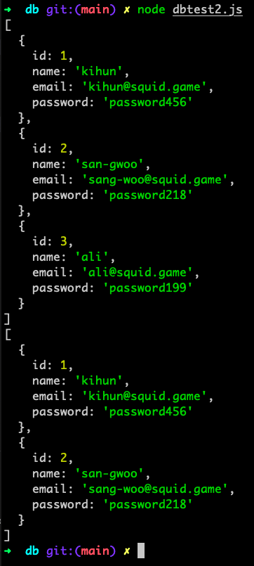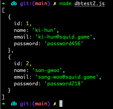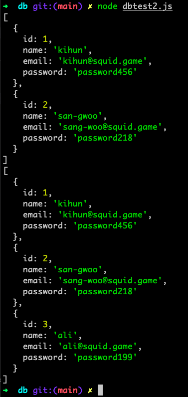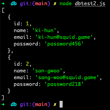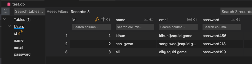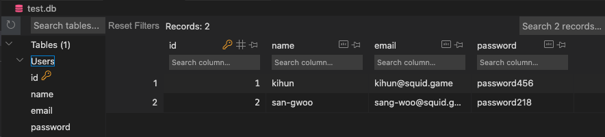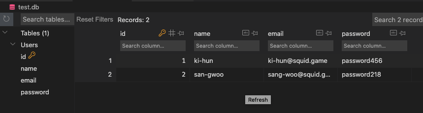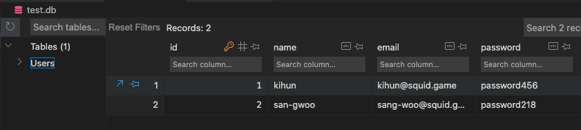 INSERT INTO Users(name, email, password) VALUES ("ki-hun", "ki-hun@squid.game", "password456"); \