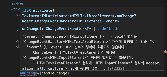 바뀐 부분은 바로 (event: React.ChangeEvent <HTMLInputElement | HTMLTextAreaElement>)처럼 event의 타입 부분인데요.