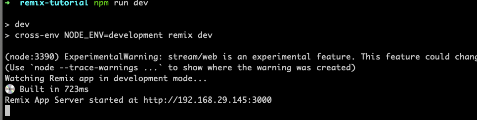 완료되었습니다. 위와 같이 나오면 아까 만든 remix-tutorial 폴더로 들어가서 dev 서버를 실행해 볼까요?