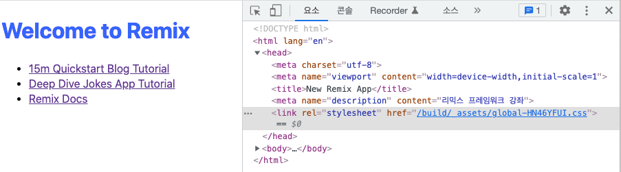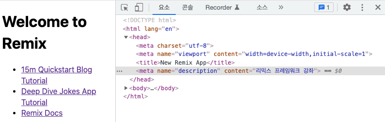App 컴포넌트에 <Meta /> 컴포넌트를 삽입하면 Remix 프레임워크는 meta라는 이름의 함수를 찾아 그걸 실행합니다.