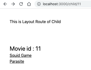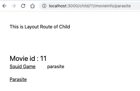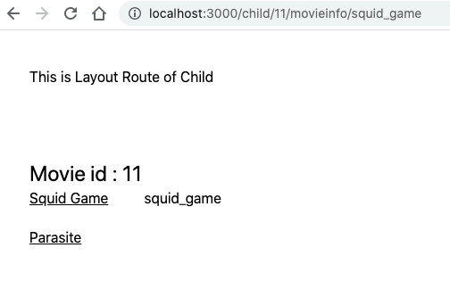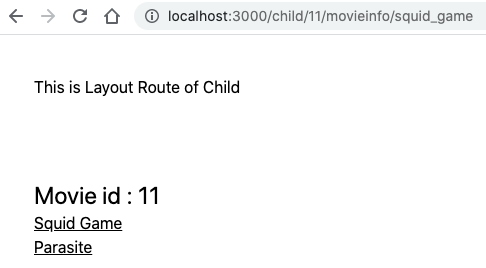 그래서 결론은 http://localhost:3000/child/11 경로 밑에 다시 http://localhost:3000/child/11/movieinfo/squid_game이라는 폴더 경로가 형성되는데요.