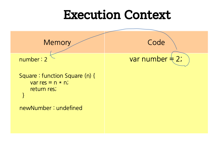 그래서 위의 코드 1행인 var number = 2; 란 코드에 의해 number라는 변수가 다음 그림과 같이 Execution Context의 메모리 컴포넌트에 number : undefined라는 키-밸류 타입으로 저장되게 됩니다.
