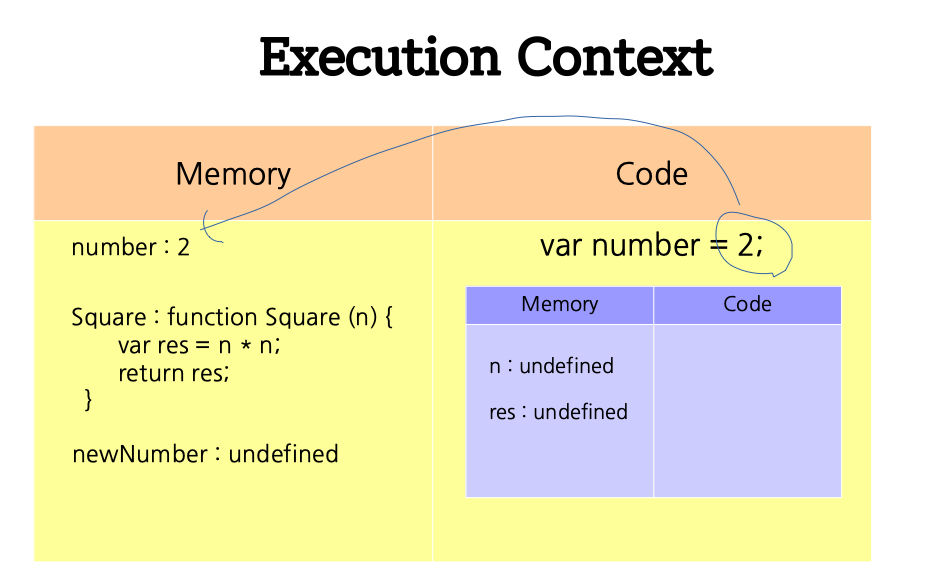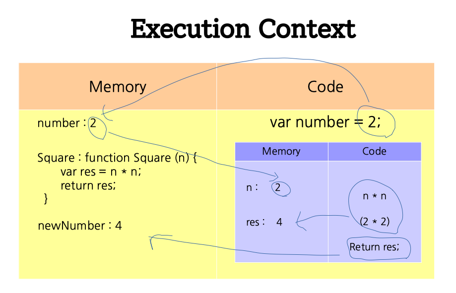 글로벌 Execution Context에서 Square 함수를 실행할 때 넘겨준 파라미터(인수) number 값을 n으로 대체하게 됩니다.