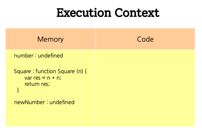 코드 컴포넌트 안에 또 다른 Execution Context가 생겼고 이 Execution Context는 함수 Square에 관한 것으로 먼저 메모리 할당 단계에서는 Square의 파라미터인 n 이 undefined으로 할당됩니다.