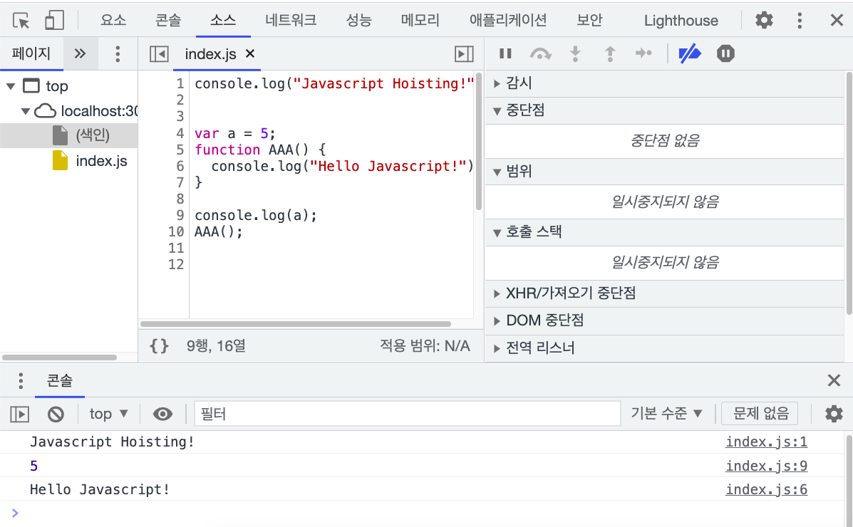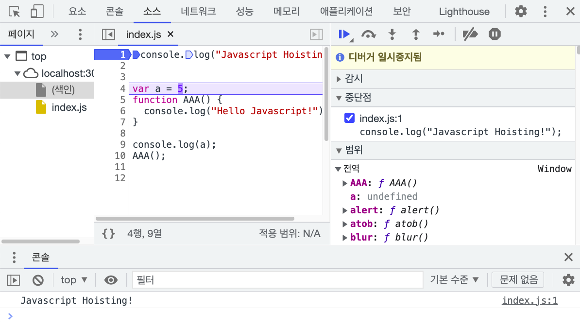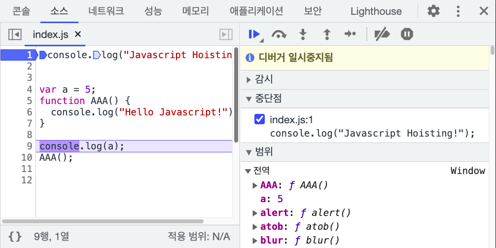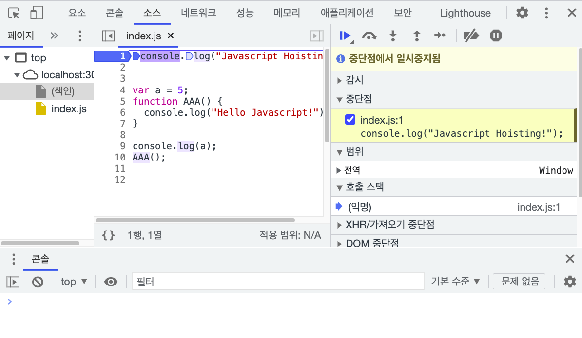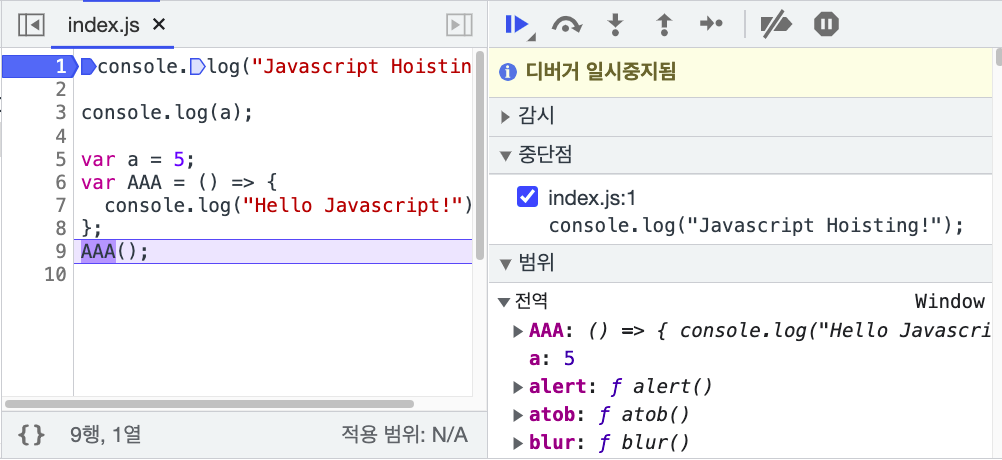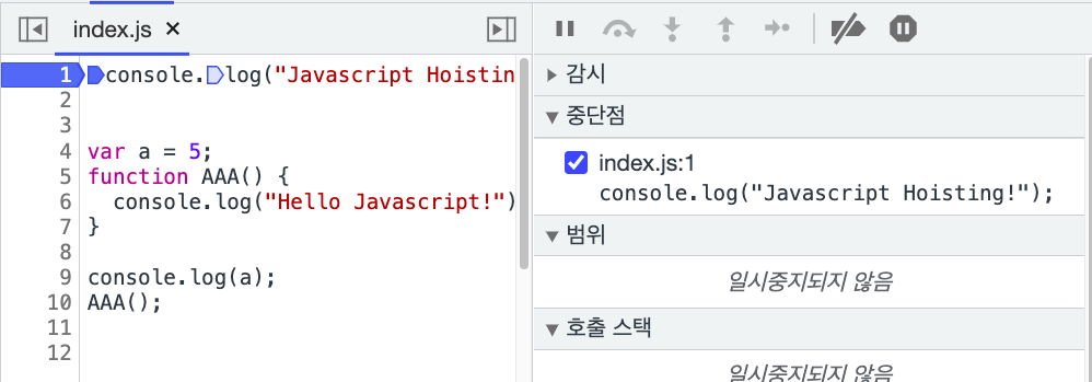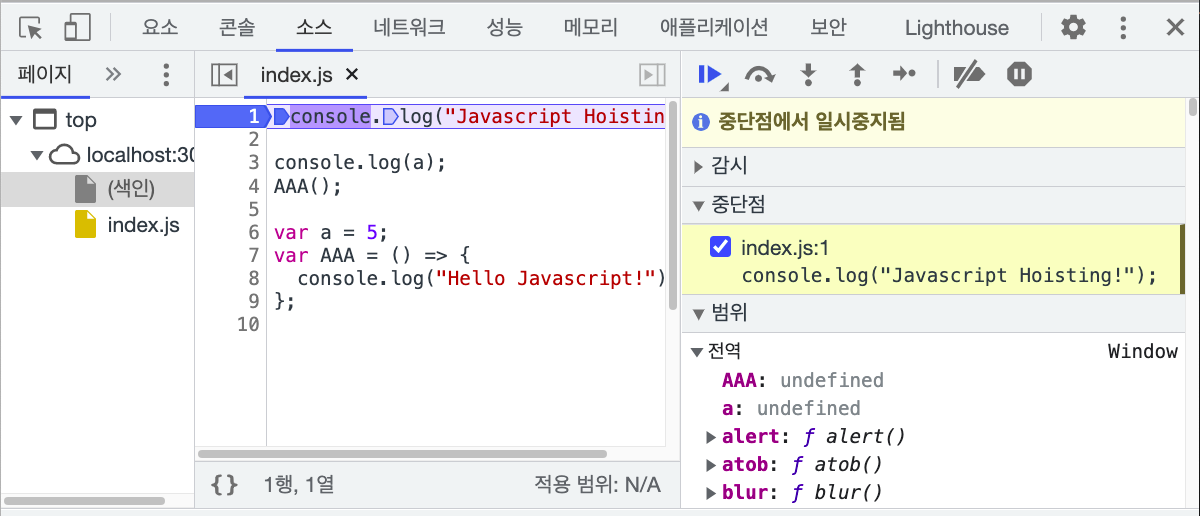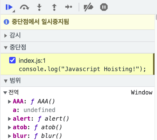 우리의 자바스크립트 코드가 중당점에서 일시중지되었다고 알려주네요