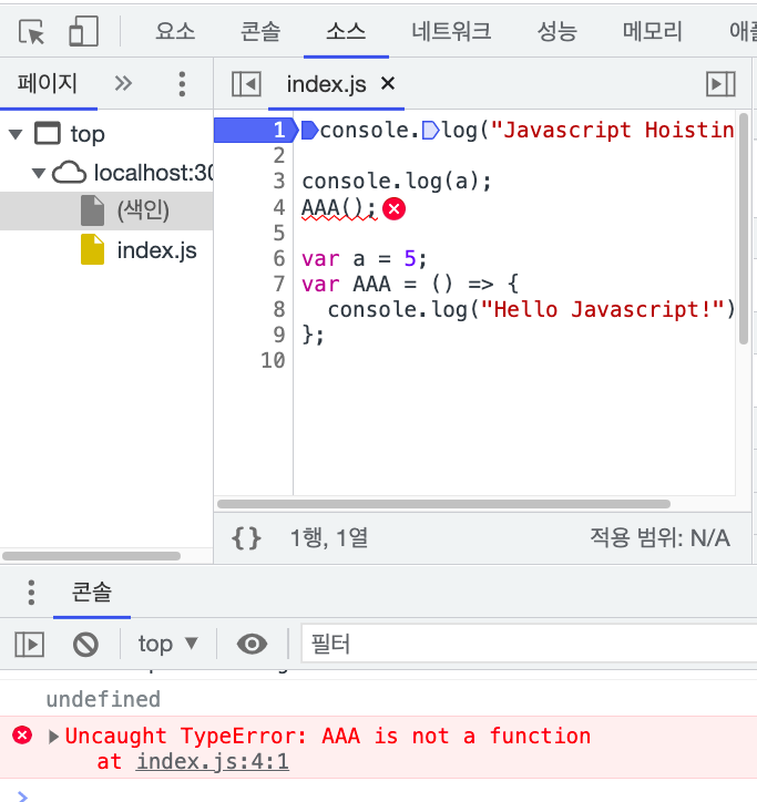 코드의 실행이 애로우 함수의 실행 부분으로 넘어가기 전까지는 AAA는 그냥 var AAA처럼 변수인 것으로 인식되기 때문입니다.