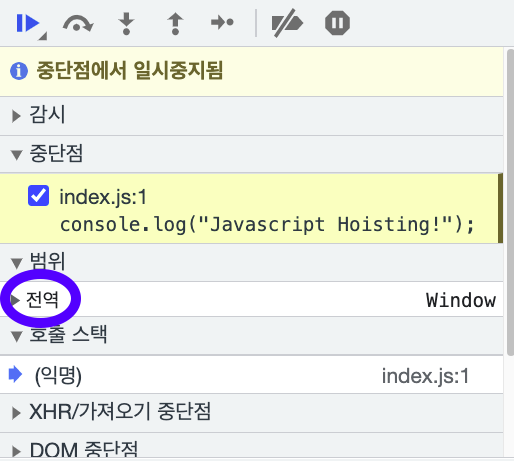 호출 스택이 현재 상태로는 Global 이기 때문입니다.