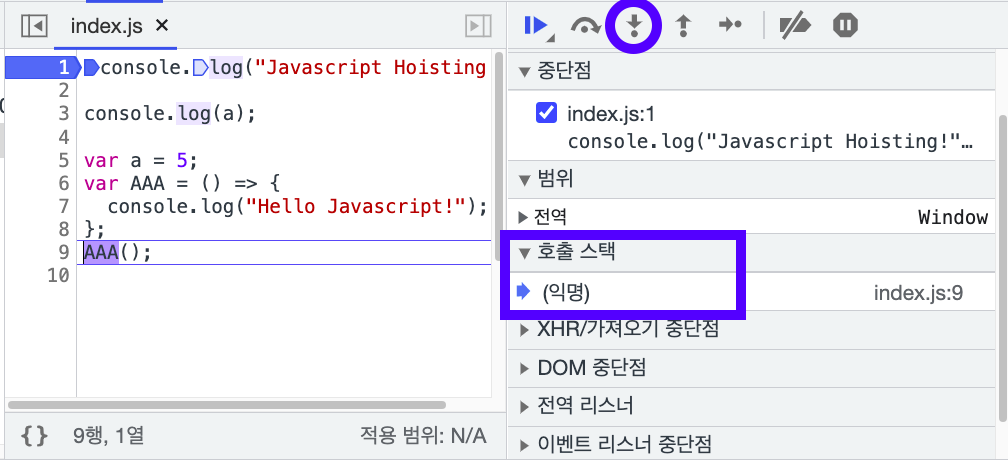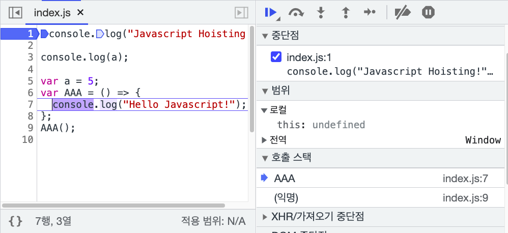 위 그림을 보시면 코드의 실행이 AAA 함수 안으로 이동했고 오른쪽 호출 스택은 바로 AAA라고 명시되고 있습니다.