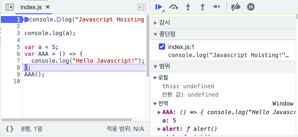 5행을 지나왔기 때문에 전역 스코프에 a: 5라고 표시되었네요.