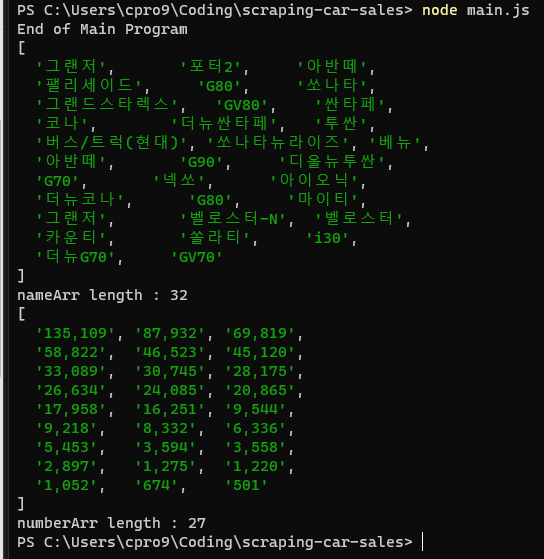 마지막으로 그 배열을 출력하면 배열의 각각이 하나의 차종 이름이 되는 것을 보실 수 있습니다.