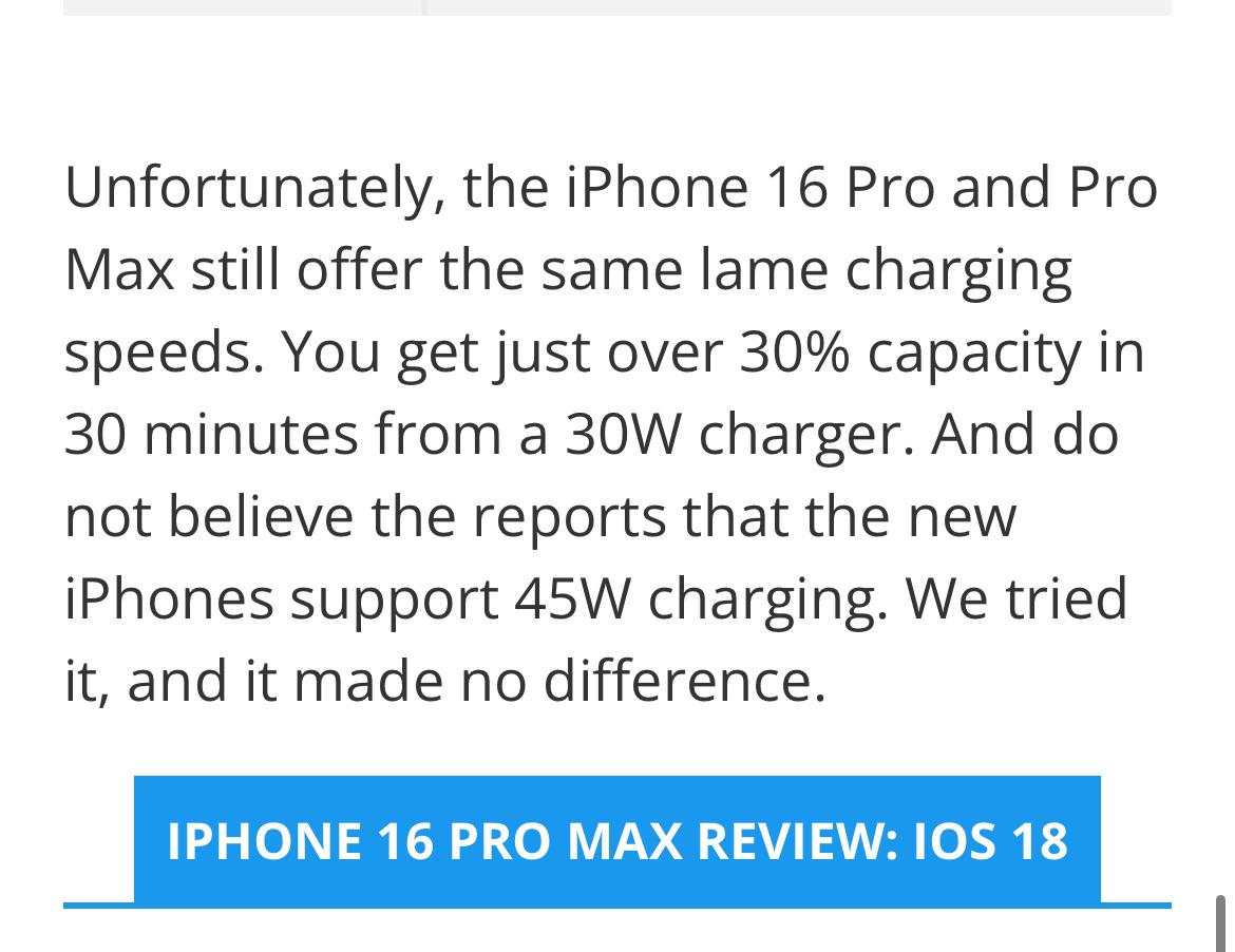 Tom’s Guide 리뷰에 따르면, iPhone 16 Pro Max는 45W 충전을 지원하지 않는다고 확인되었습니다.