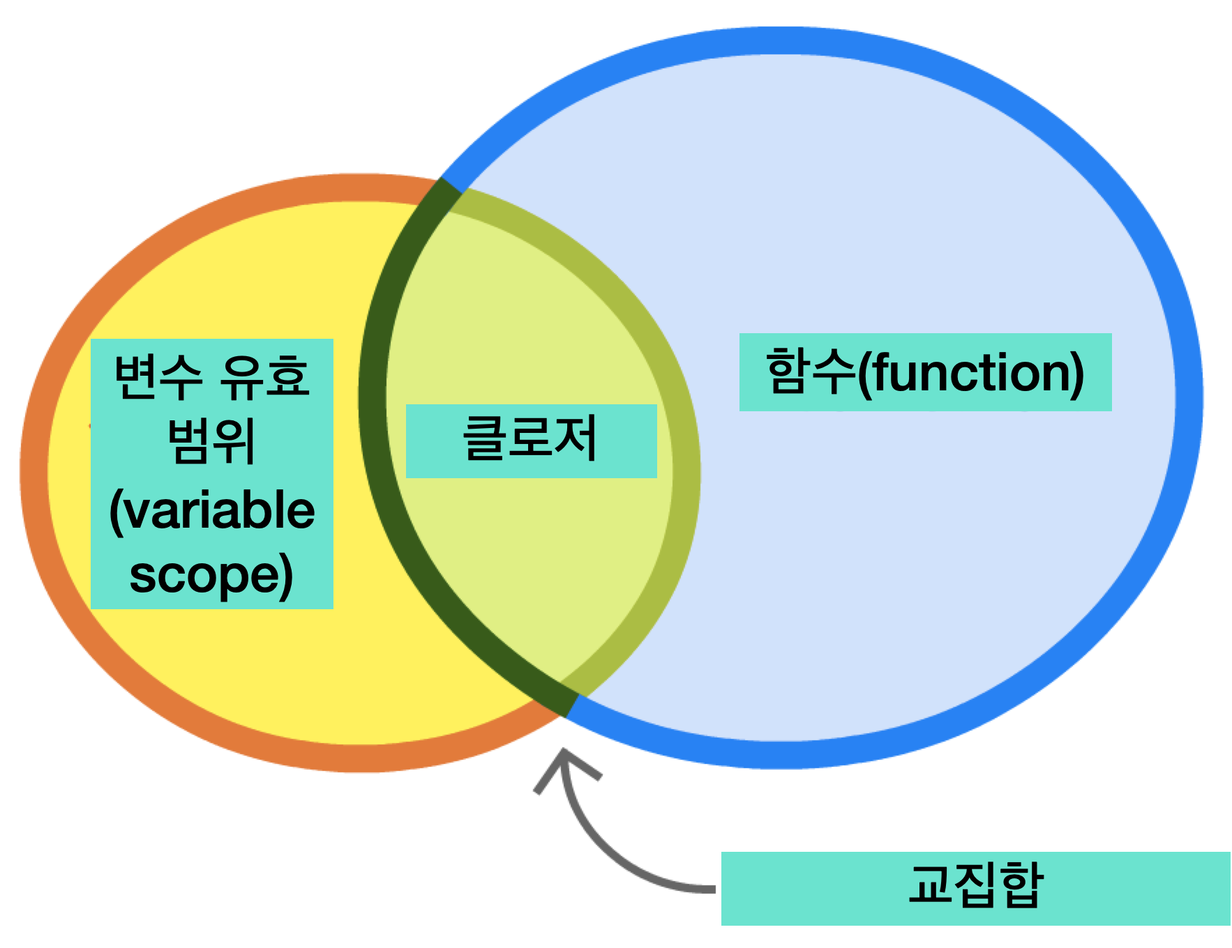클로저는 함수(function)와 변수 유효 범위(variable scope)가 교차하는 교집합이라고 볼 수 있습니다.